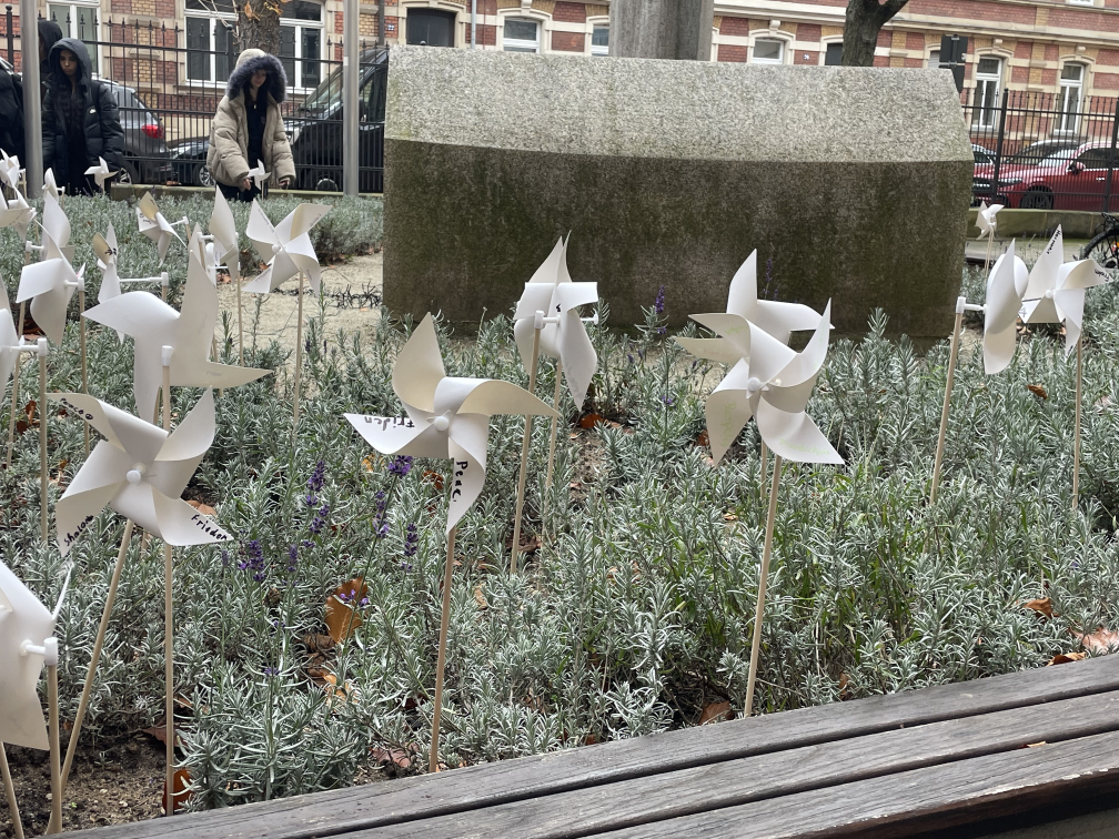 Im Anschluss an den Film wurden zudem Windräder gebastelt, die am Ende der Veranstaltung im Erinnerungsgarten des Gymnasiums einen Platz fanden. Diese kreativen Windräder symbolisieren nicht nur Hoffnung und Veränderung, sondern ergänzen den Ort des Gedenkens um eine lebendige Dimension.